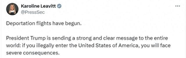莱维特在社交媒体上分享了几张照片,内容是一些戴着手铐的人登上军用飞机。莱维特指出:“驱逐航班已经开始,特朗普总统向全世界发出了一个强烈而明确的信息:如果你非法进入美利坚合众国,那么你将面临严重的后果。”